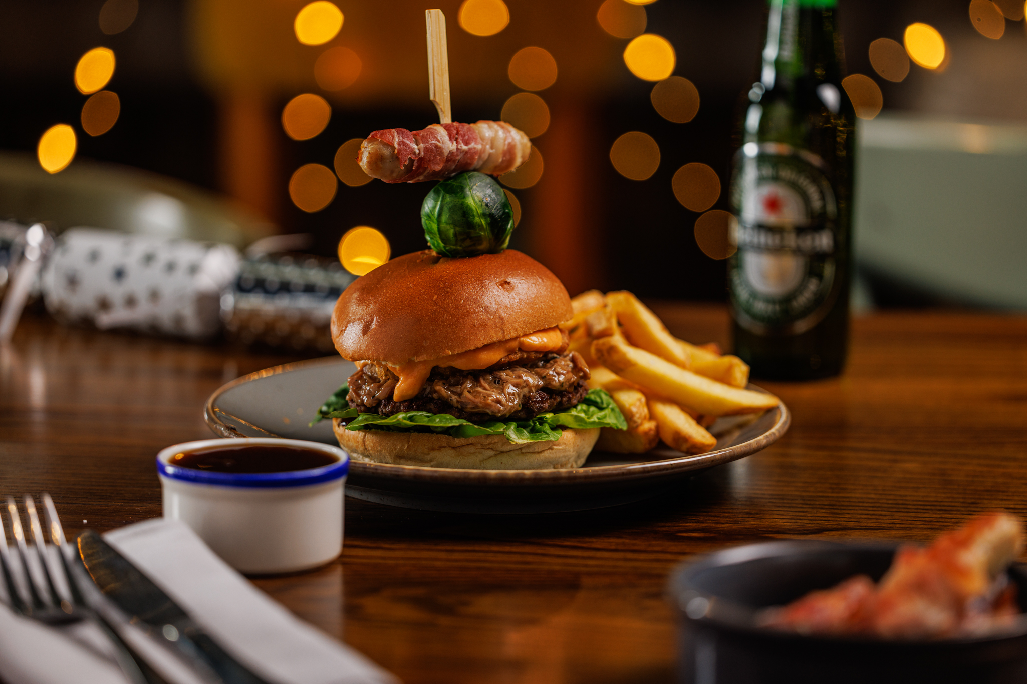 The festive stack burger, 3oz beef patty, BBQ pulled turkey, crispy onion rings, nacho cheese sauce and topped with a pig in blanket. Served with skin-on chips and beef dripping gravy 1894 kcals